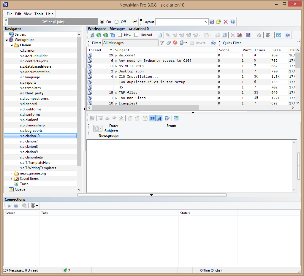 I tried a bunch of different clients before I found this one and they all sort of do the same thing but what really made this one stand out was the ability to use Microsoft SQL Server for message storage (ADS and MySQL are also options). Other than reading new messages one of the primary things I used the Clarion/Softvelocity newsgroups for was to access the archive of knowledge stored in there. Searching is awesome and fast as it makes use of Full Text Search features of the targeted backend.