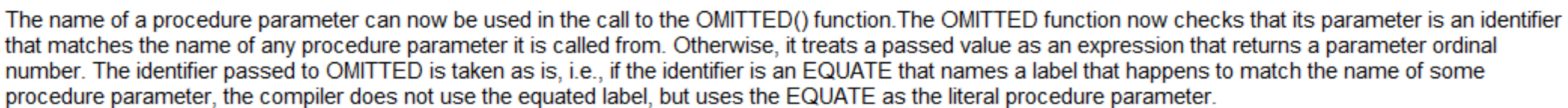 In an ABC procedure, if you want to test if a parameter to the procedure is OMITTED you need to do that in a routine to the procedure itself, not in a method like ThisWindow.Init()