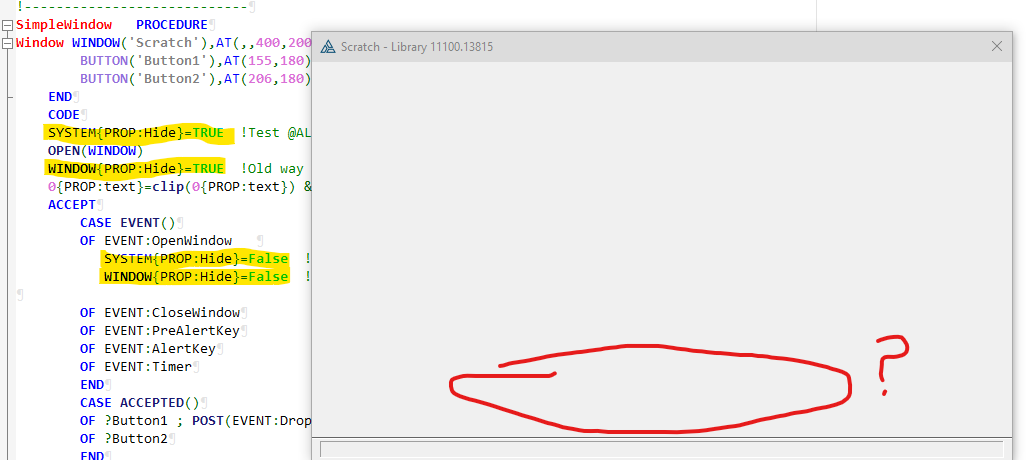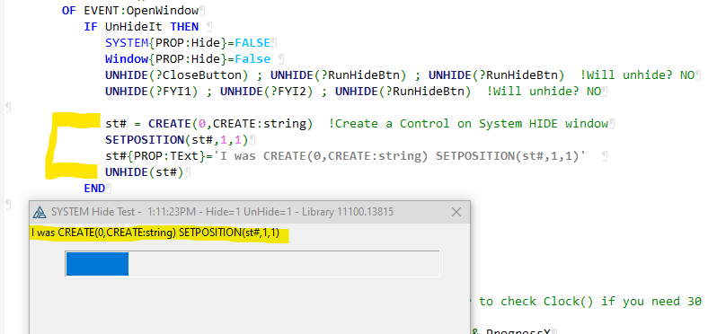 UNHIDE(?CloseButton) ; UNHIDE(?RunHideBtn) ; UNHIDE(?RunHideBtn) !Will unhide? NO