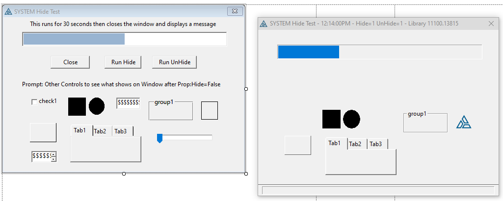 In the below screen capture the Designer Window is on the Left showing all controls, and the runtime window is on the left. You see Button, String, Prompt do not unhide. The Progress control still works. The window is in a Disabled like state that nothing can be clicked, but the Escape key works.