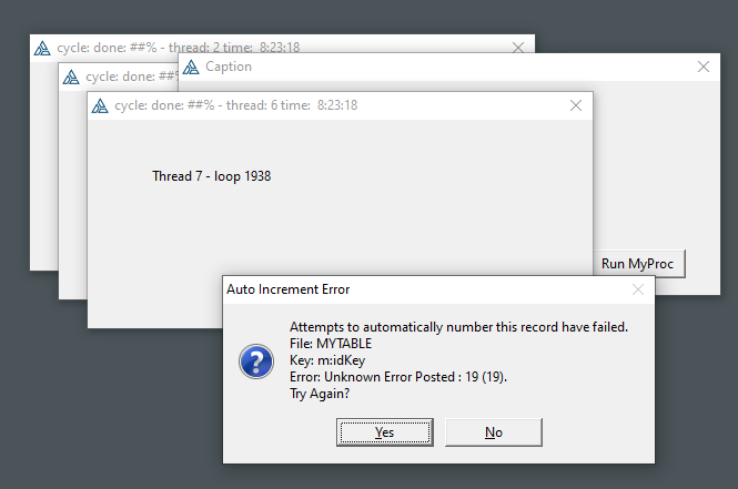 0{PROP:Text} = 'Cycle: ' & mLoop & ' Done: ' & FORMAT(L/(mLoop*10)*100,@n02) & '% - Thread: ' & THREAD() & ' Time: ' & FORMAT(CLOCK(), @t4)