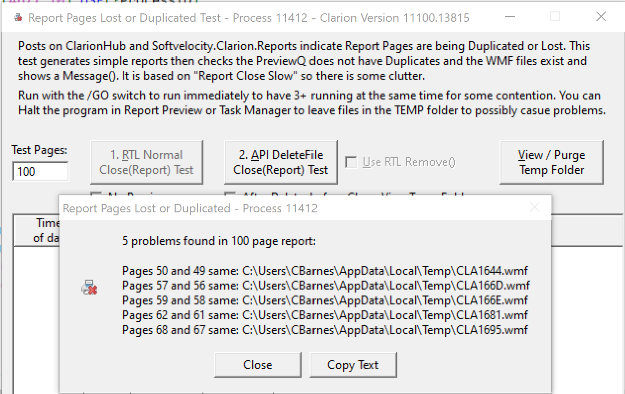 To create more contention you can run multiple at the same time with the /GO common switch. I include a Run3.BAT that does START ReportPagesLostTest.exe /GO 3 times.