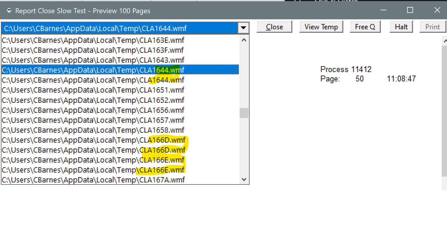 The Previewer in this test lets you see the Queue and screen shot below shows those files appear twice. Note the Report pages have the “Process ID” so it would be possible to tell if the WMF file was from a different process. I did not check for that… yet.