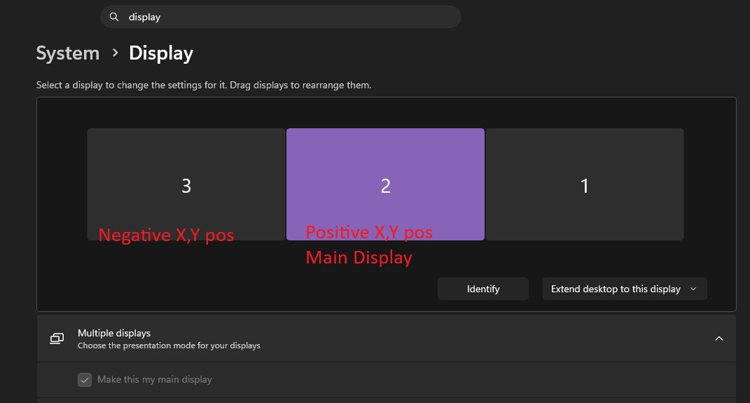 Every monitor to the right (or above) the main display will have a positive XY pos.
