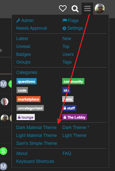 Once you are logged in, you can select a theme from the hamburger menu on the top right: