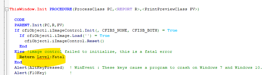 If you move your code to ThisWindow.Init() without params it will compile with your Return Level:Fatal