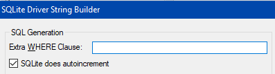 Also puzzling is that the Driver String Builder for SQLite for the following selection results in Driver options defined as /AUTOINC=**FALSE** … which is back-to-front, surely ? (I assumed it was).
