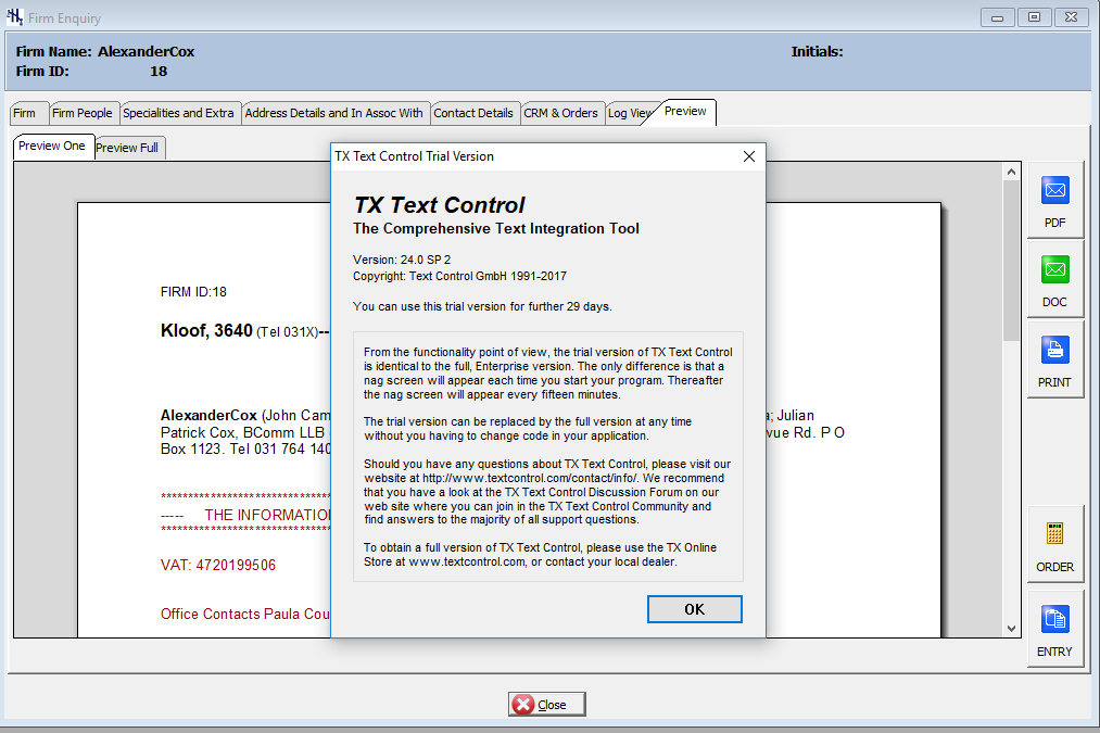 After a long search and lots of guessing I installed TX Text Control ActiveX Server on my home PC then when I compile and run it now works perfectly - BUT it does not work if I run the exe outside of the IDE?