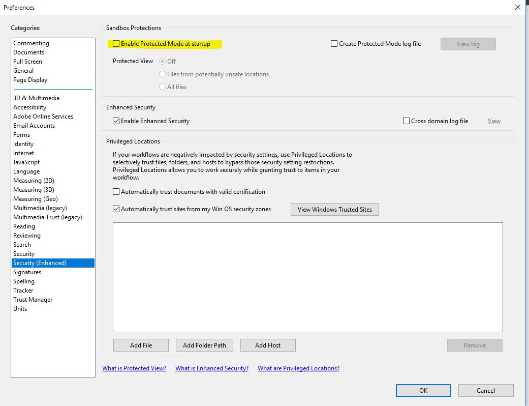 "Try going to “Edit/Preferences/Security (Enhanced) and set “Enable