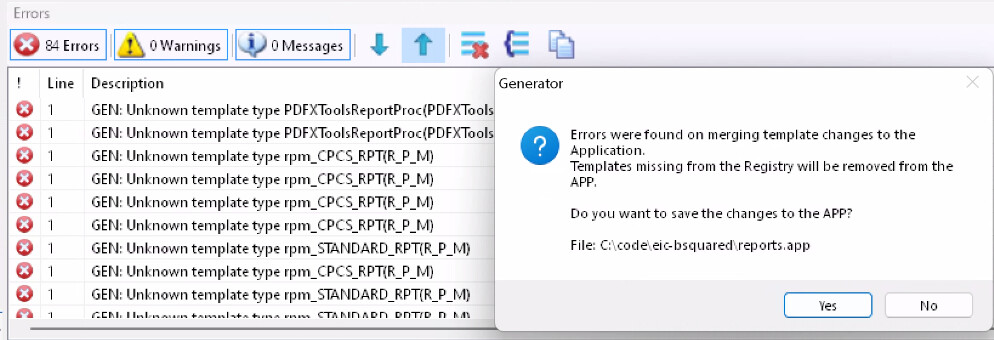 After this the App has the missing templates removed so is damaged. After clicking Yes the load continues. Clicking No seems to get stuck in a loop, so you have to click YES and recover the APP from backup.