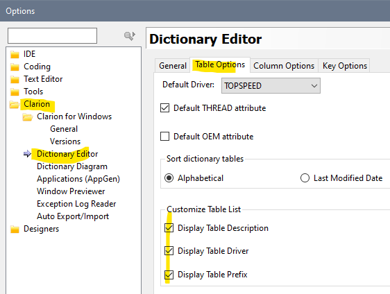 Pick the Table Options tab and check the highlighted items so the Tables panel shows Driver, Prefix and Description. You can also set your Default Driver (e.g. TopSpeed) and how to Sort files in IDE which I use Alpha.