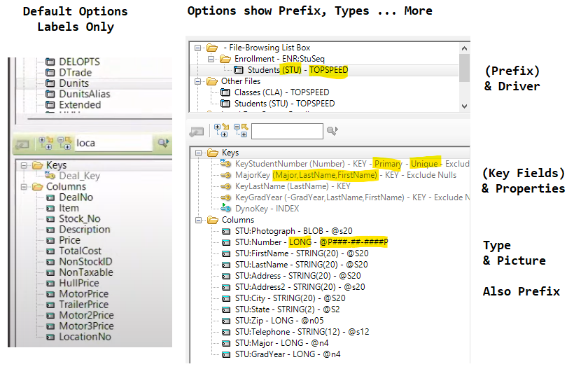 You may find it odd to show PRE: on every Column. If you don’t you have to glance up at the File to see (PRE). Also the IDE does not show the PRE on the Primary file. So I find it most obvious to see it in the list of fields.