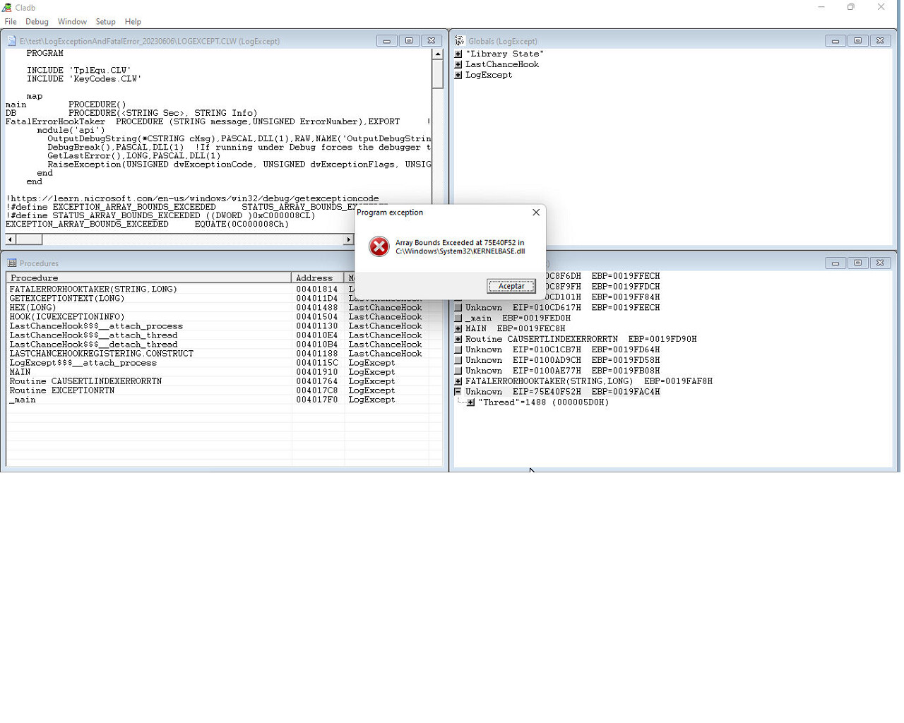 in the procedure that produce the exception error, at timer oldHandler = SYSTEM{PROP:LastChanceHook} !Read address of oldhandler SYSTEM{PROP:LastChanceHook} = ADDRESS(MyHandler)!Call new handler