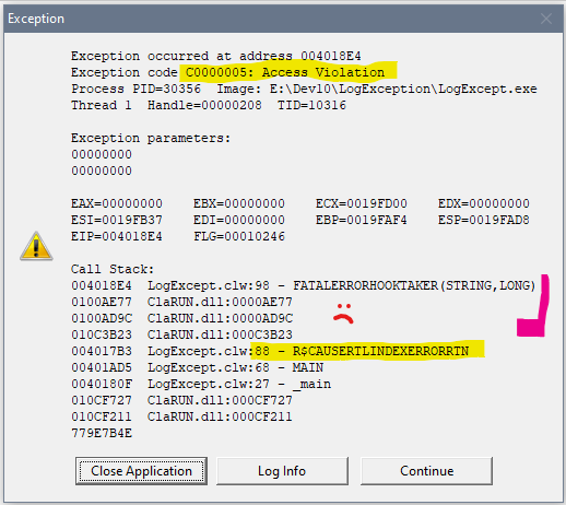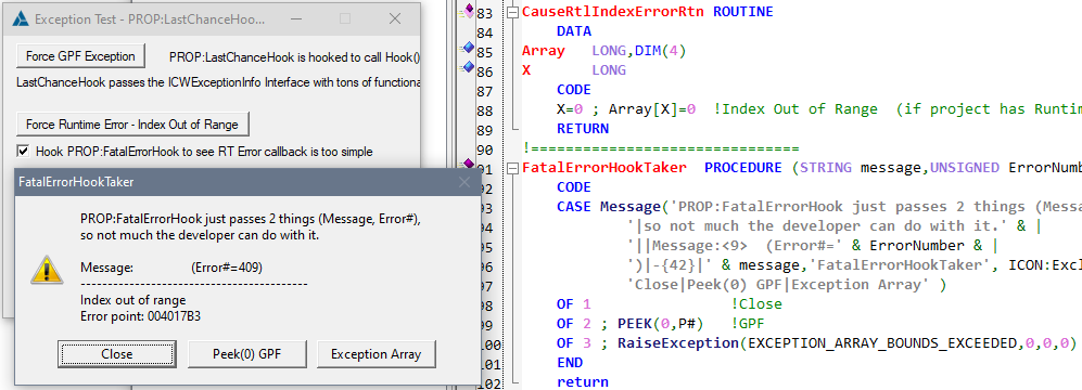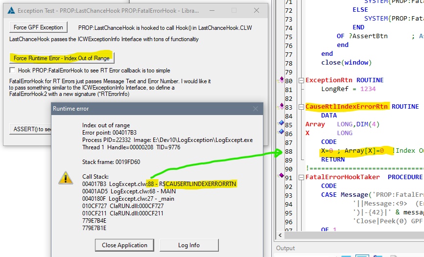 Attached revised test program so Index Fatal Error message has button for “Access Violation” that works calling RaiseException(EXCEPTION_ACCESS_VIOLATION,EXCEPTION_NONCONTINUABLE,0,0)