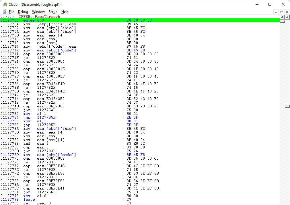 There you can see on the first part the codes that will not show the exception window, then a test if “flags” has the second bit toggled on* to show that window no matter with exception code it was, then a list of codes that shows the window: C0000005 and other internal codes.