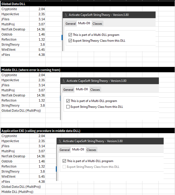 My application is using Multi-Proj, has a data DLL, several DLL’s in between and a Main exe. I feel like it is a rather by the book setup of multi-proj. I do have the nettalk DLL in the data dll as well as the exe, and other DLL’s where net talk needs to be used. I am using netalk desktop 14.36 which seems to be the latest.