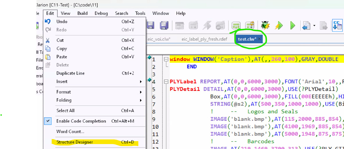I work on code that uses .RDEF file Extension to hold Reports. I cannot find a way to use Structure Designer for that. Ctrl+D does not work, and the Edit menu does not have the Structure Designer choice.