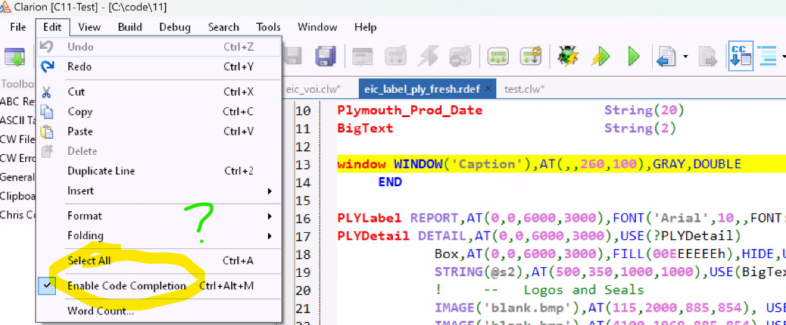 Below you see a WINDOW in an .RDEF file and the Edit menu missing Designer. It’s the same for the REPORT.