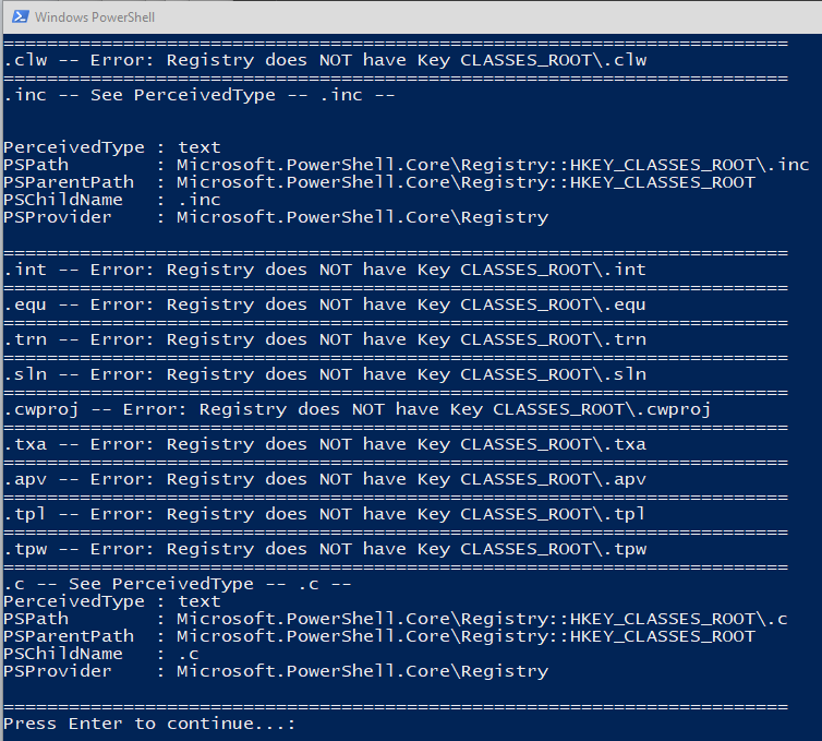 { ECHO ($DotExten + " -- Error: Value PerceivedType does NOT exist for CLASSES_ROOT\" + $DotExten ) }