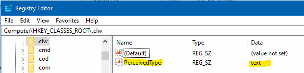 Windows 10 made it easier by allowing the value "PerceivedType"="text". There are posts about the new key not always working and needing to use the old ShellEx GUID key, or about having to delete the old ShellEx key, so it’s good to know those keys. If you’re running Windows 7 or 8 you must use those ShellEx keys. Should be able to edit my .REG file with 2 Search-and-Replace’s