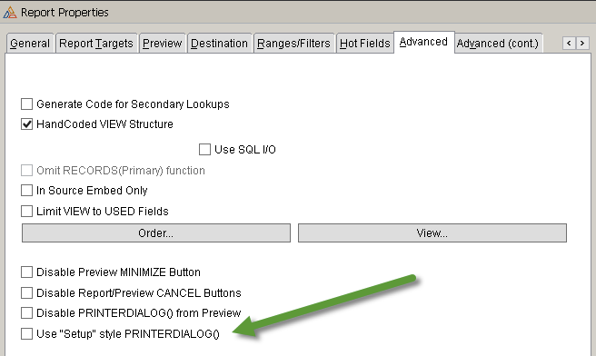 No. Turning on the “Use ‘Setup’ style PRINTERDIALOG()” made no difference. That is the first thing I tried before I put in the print preview code from the online help and then added a way to try all eight variations of PRINTERDIALOG / PRINTERDIALOGA.