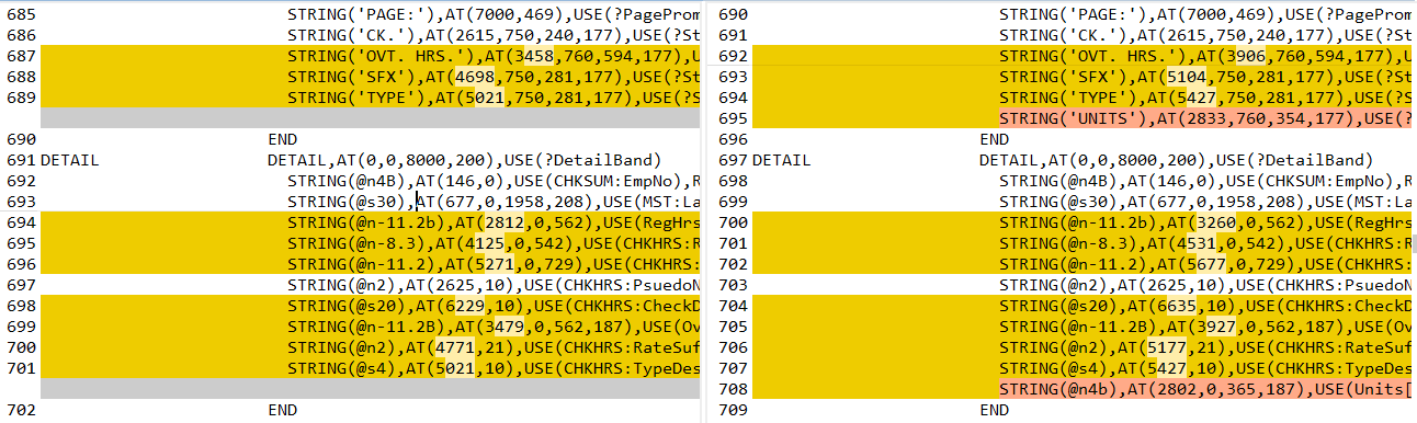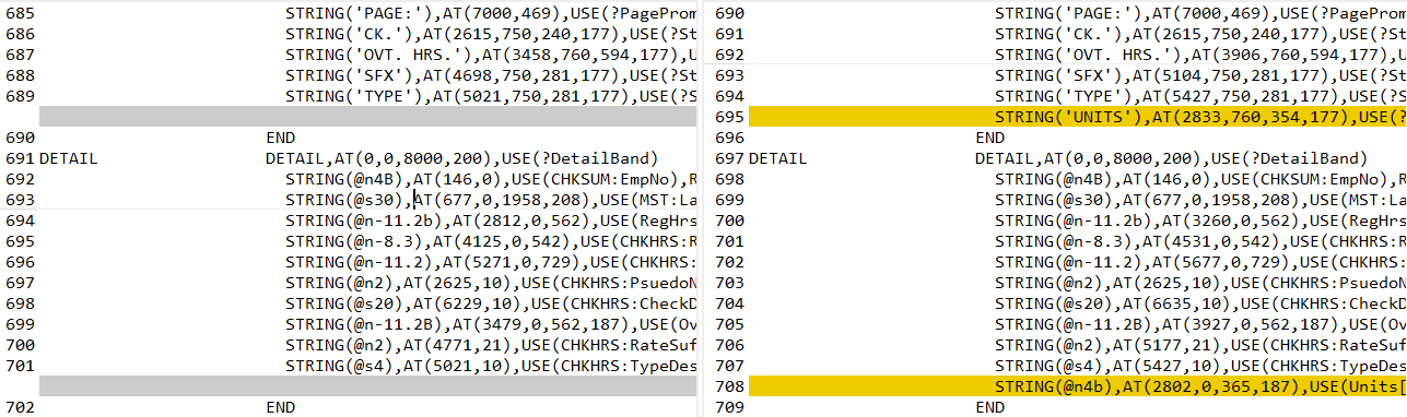With Ignore Numbers checked my compare now ignores all the lines where only the AT() changed leaving just the 2 new STRING(‘UNITS’):