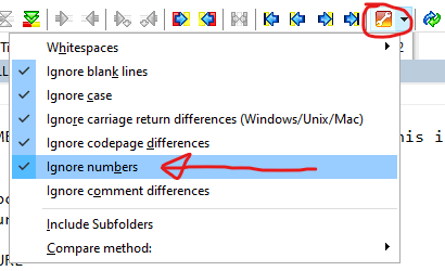 Under the toolbar Options button (wrench icon) is a new check item to “Ignore Numbers” in the comparison.
